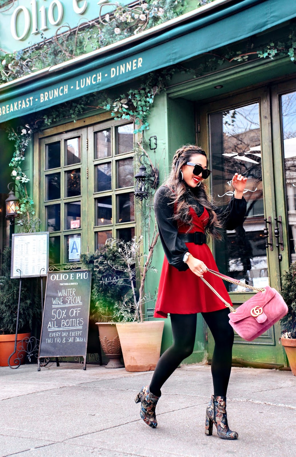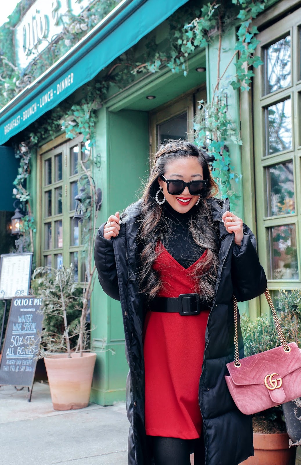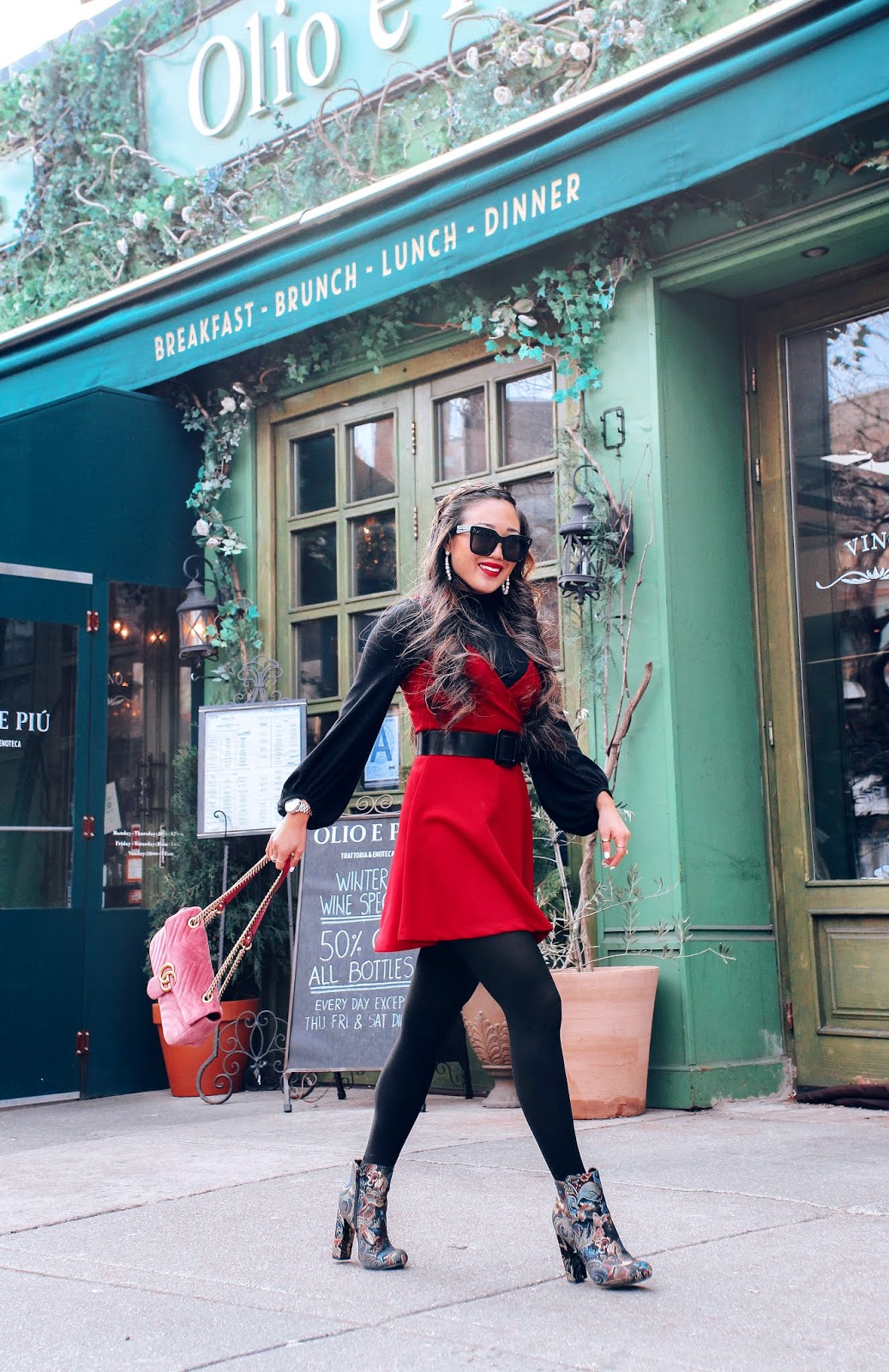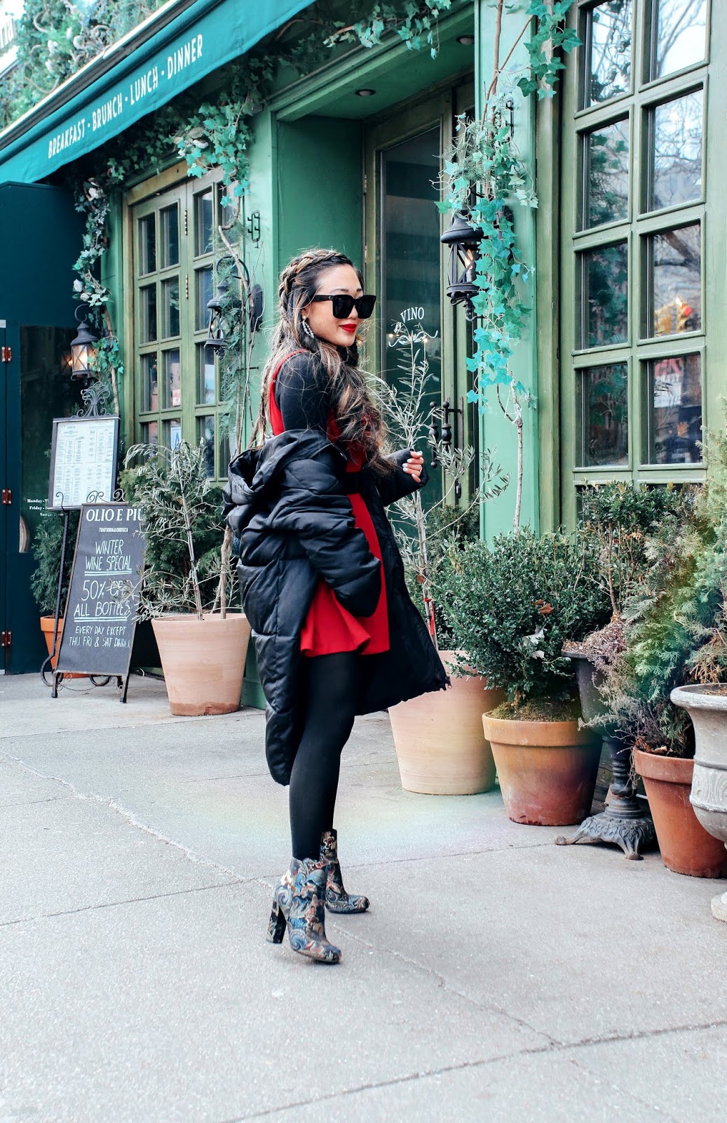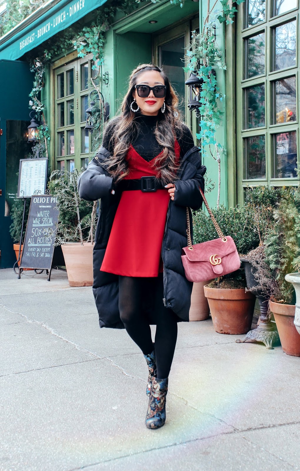 I had originally wanted to wear this dress without layers because I love the fit of this V-neck dress, but realistically, not going to happen with the frigid NYC temps here, so I decided to wear a balloon-sleeve crop top, the comfiest tights, and finished the look with a belt.