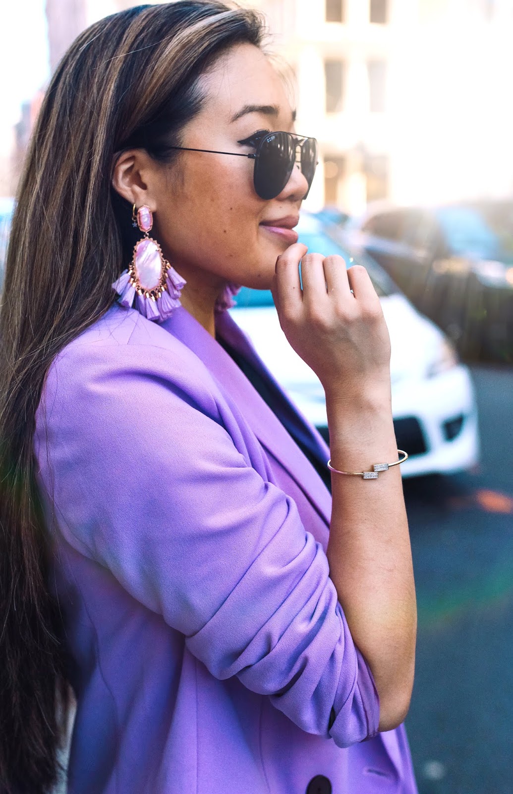 Wearing: purple blazer | black romper (old) but similar here | black boots | Kendra Scott earrings (old) but similar here | sunglasses | Gucci belt | bracelet | watch (old, but similar here) |
