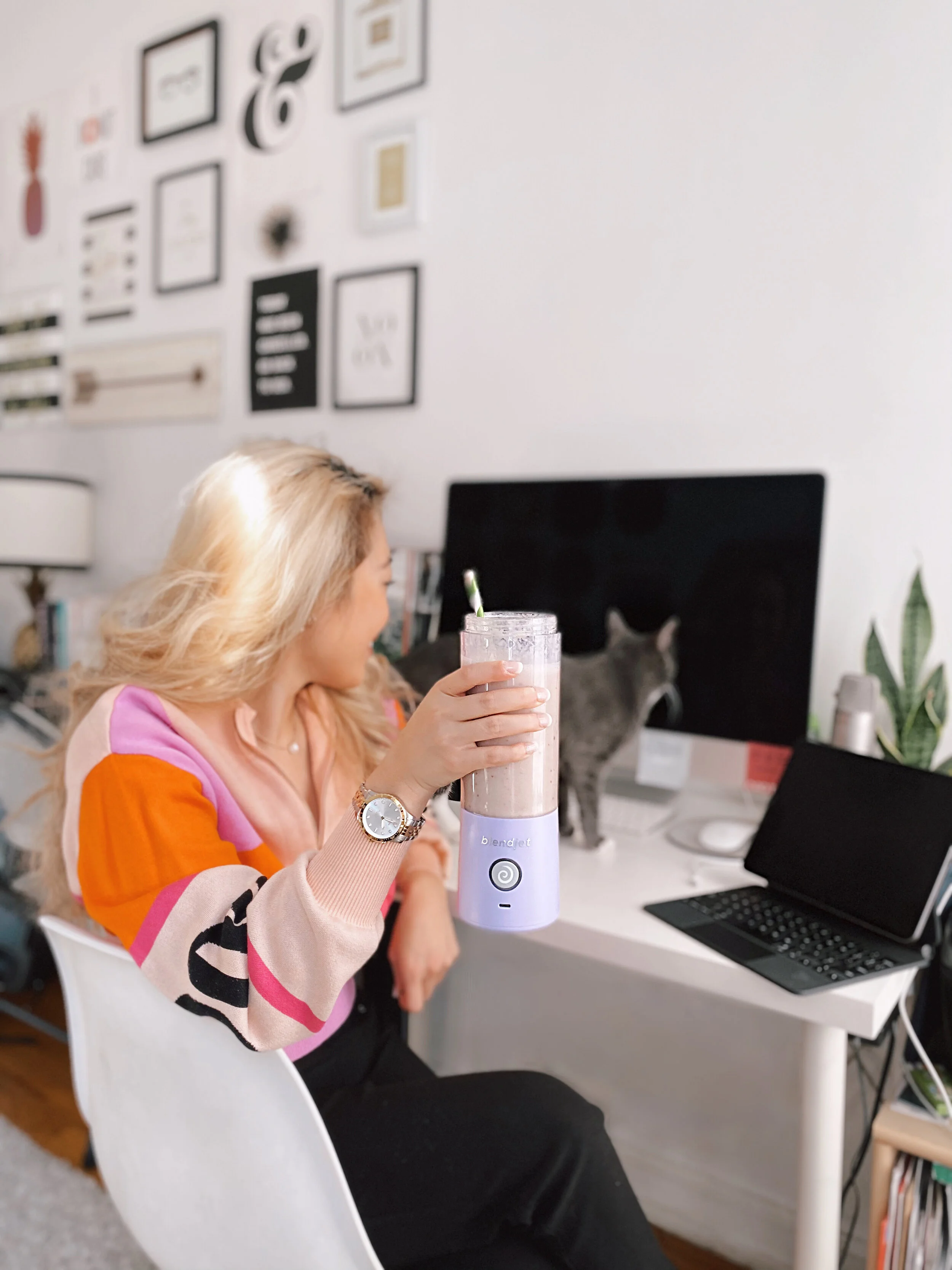 I’m a girl of routine — I have my devotional to start the day with, hot lemon water with a drop of honey on an empty stomach, and then my clients’ Instagram accounts to look through in the mornings. Afterwards, I’ll go for a run or do a workout in my apartment. But one of the things I look forward to post-workout is my homemade smoothie. Before my BlendJet days, I would normally buy a protein smoothie from Juice Generation on my way home (aka $12 a smoothie), or blend one up in my Ninja. But now, I no longer crave the Juice Generation protein smoothies and just make my own because of how simple and easy it is to make with the BlendJet.