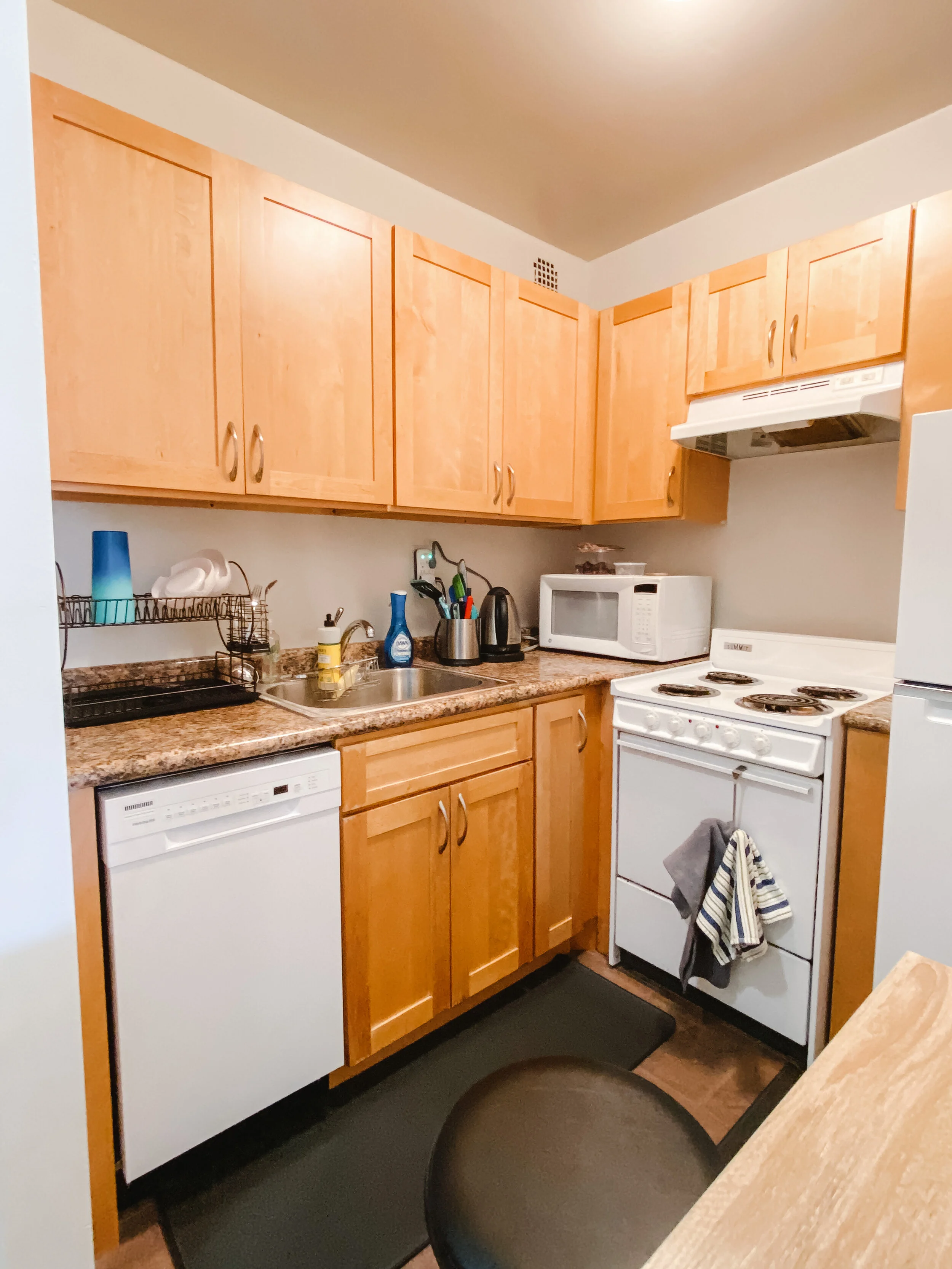 My friends already know this, but I am so happy to finally have a real kitchen. My previous kitchen in the old apartment was pretty small. I barely had room for a kitchen table and there were no counters. This one gives me a little more room with more kitchen storage space and a cute little dishwasher.