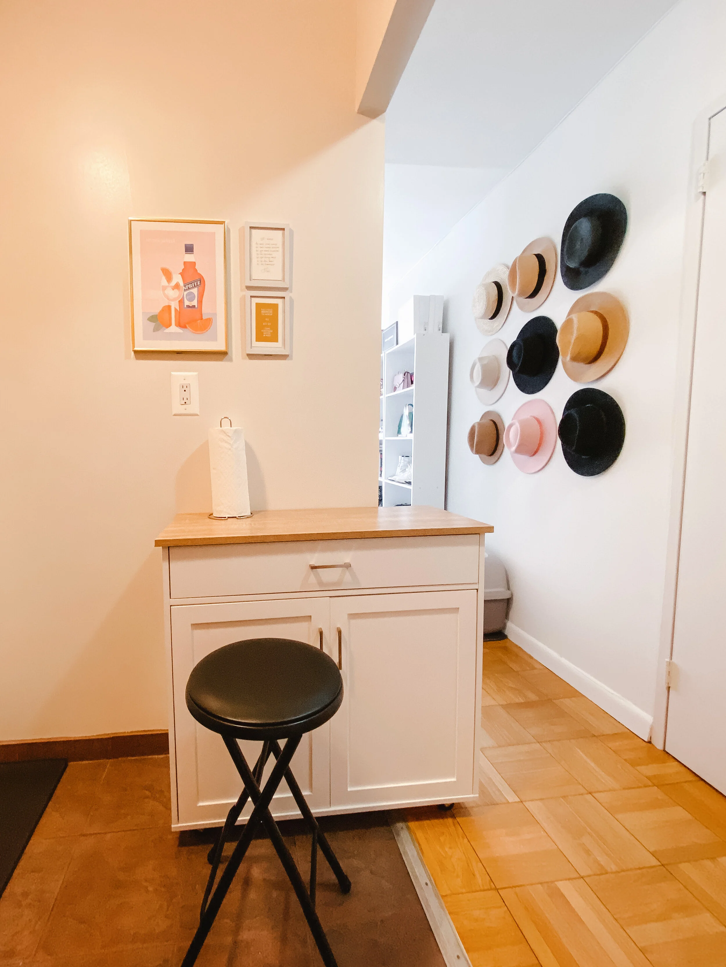 Trying to figure out what to do with this kitchen island was challenging. We turned it every single way to figure out how to place it without it being in the way. Because my fridge door opens backwards — I know, I’m still not fully used to it — this was the best option. My dad took off the ends of the kitchen island and I like that I still have a place to eat INSIDE my kitchen rather than using my office desk.
