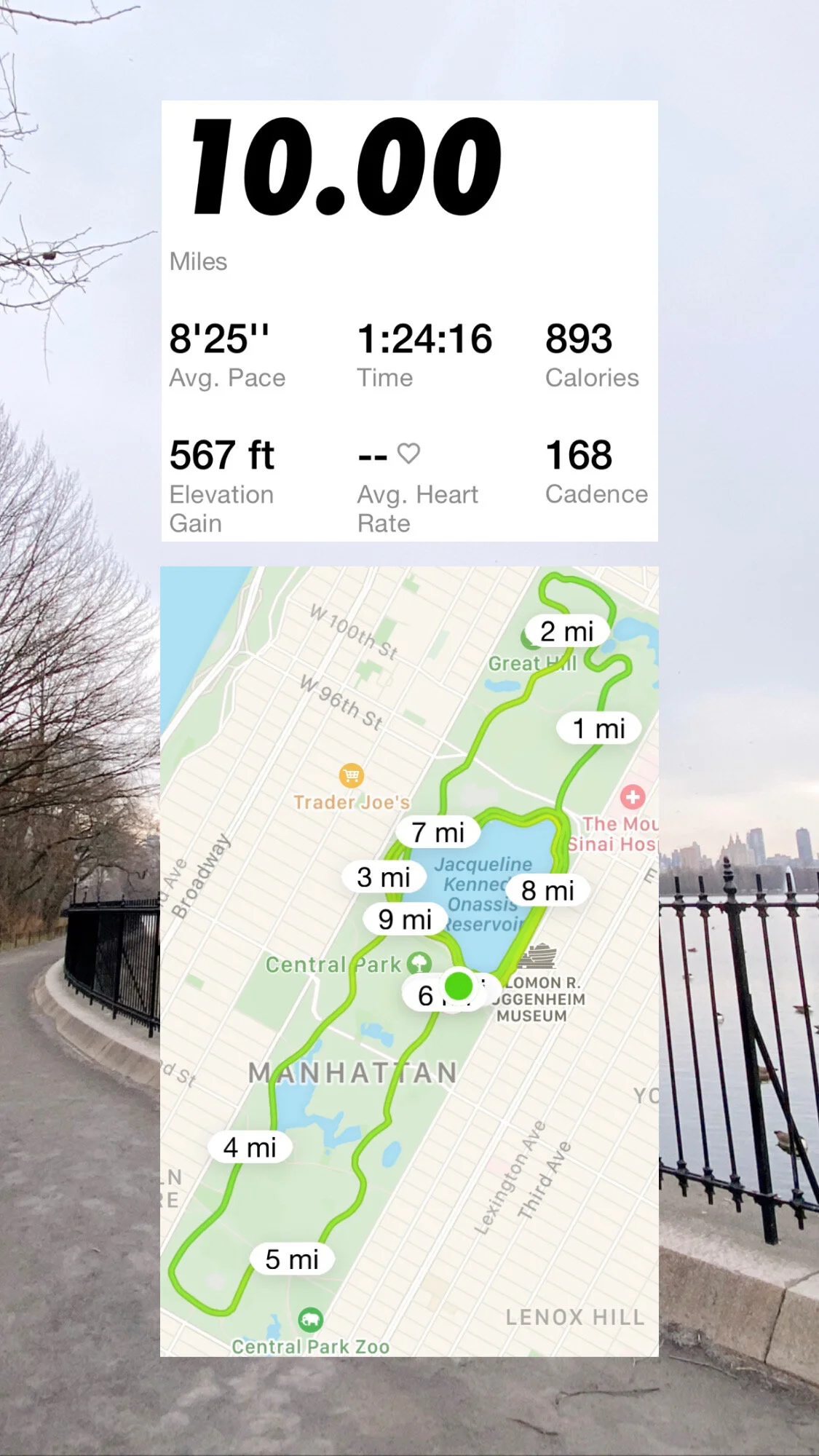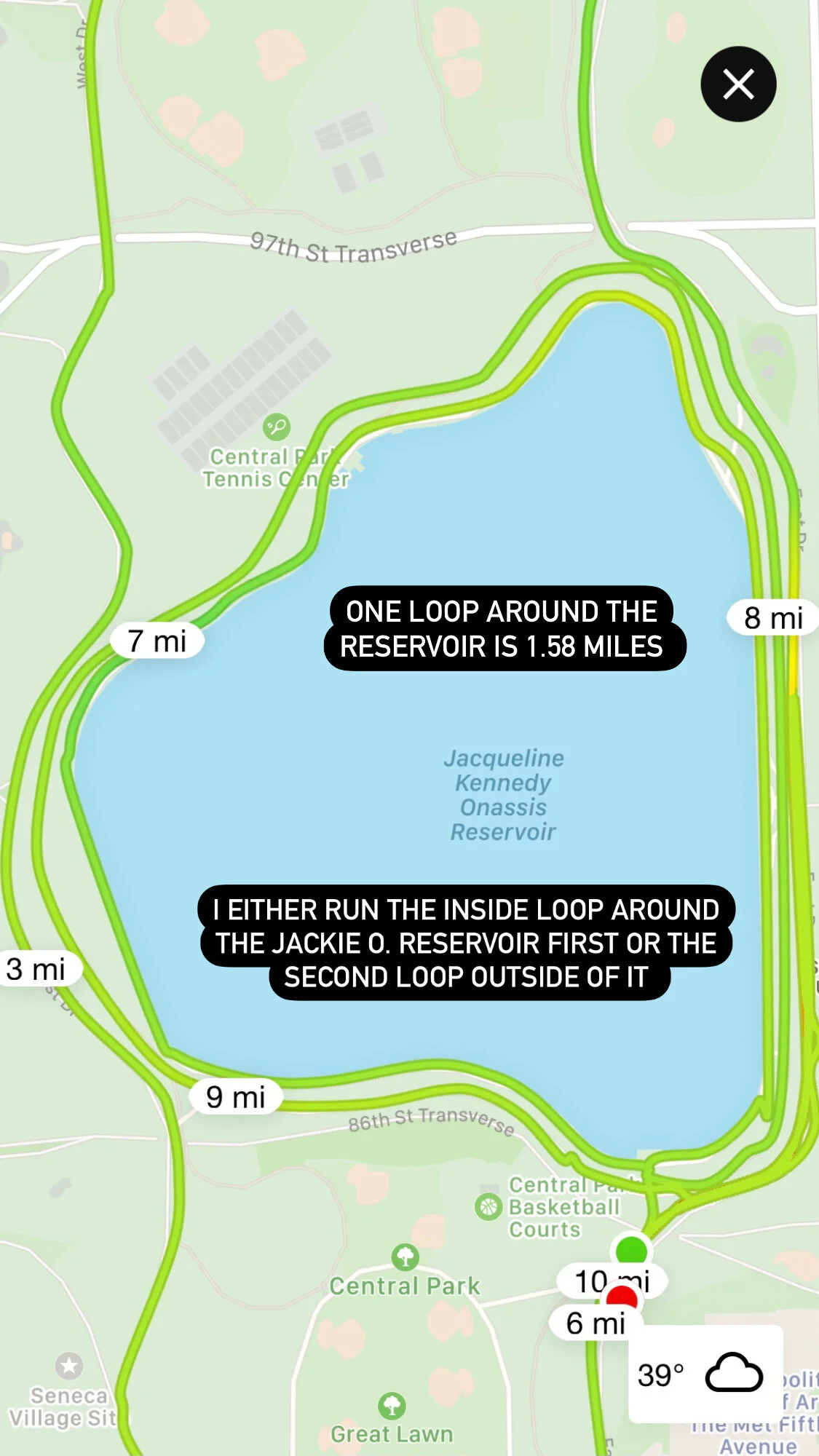 To wrap up, miles 6 and 8 are either the inside loop around the Jackie O. Reservoir or the second loops outside of it (depending on how I’m feeling). Then, I’ll run the other loop for miles 8, 9, and 10.